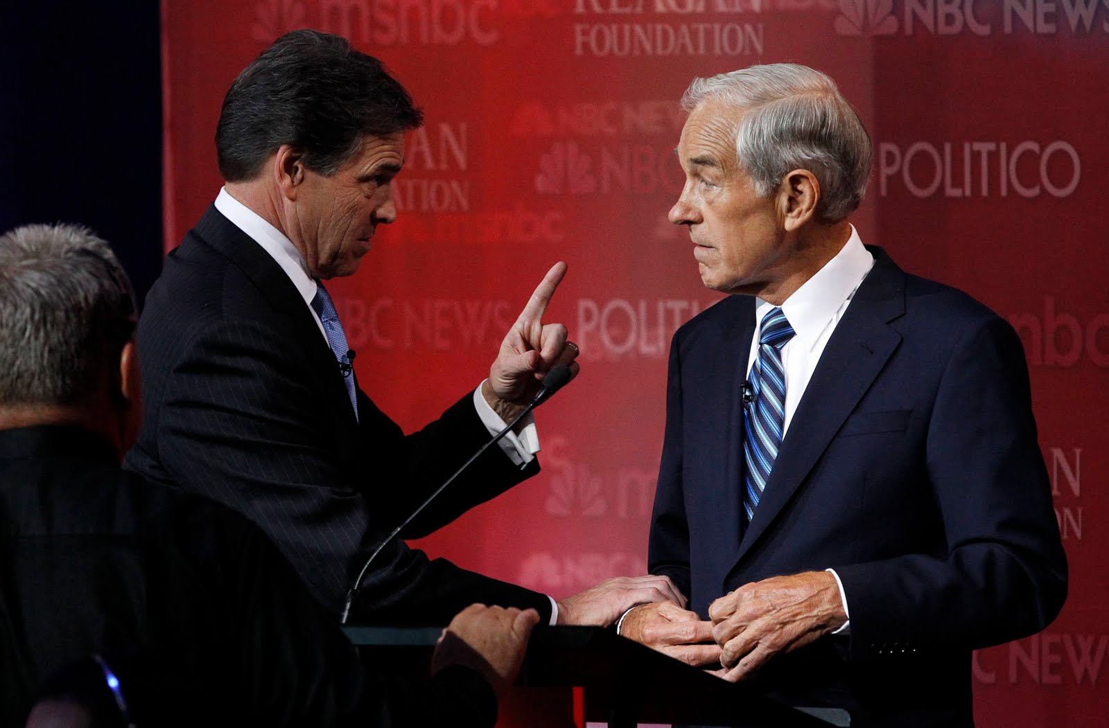 From the Washington Times account titled Perry vs. Paul: A Texas-sized war:At one point when the video cameras weren’t rolling — though the incident was caught by still photographers — Mr. Perry walked over Mr. Paul’s lectern, took hold of the congressman’s wrist and wagged his finger at him.